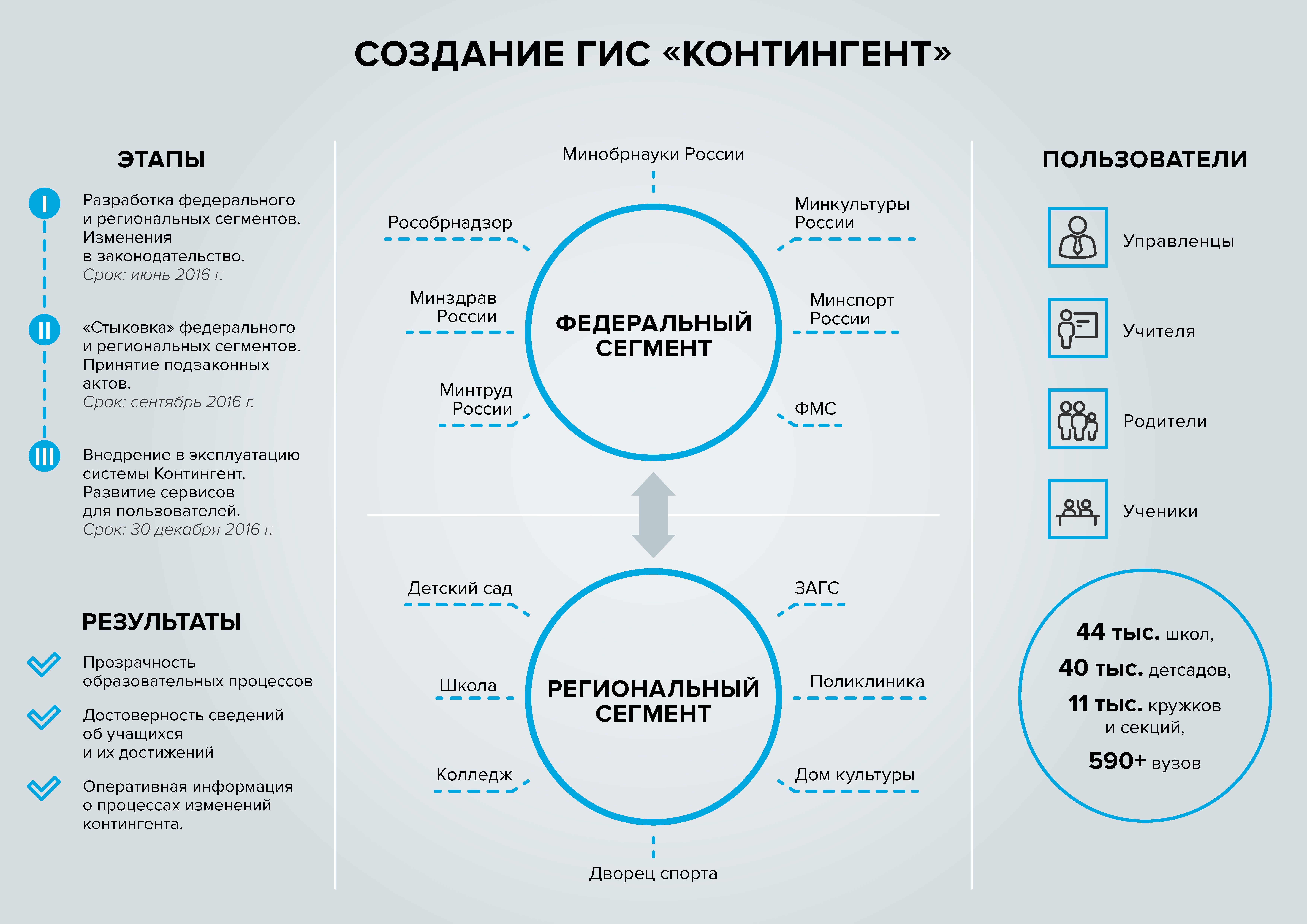 Основание для создания и развития информационной системы является Концепция создания единой федеральной межведомственной системы учета контингента обучающихся по основным образовательным программам и дополнительным образовательным программам, утверждённая распоряжением Правительства Российской Федерации от 25 октября 2014 г. № 2125-р.